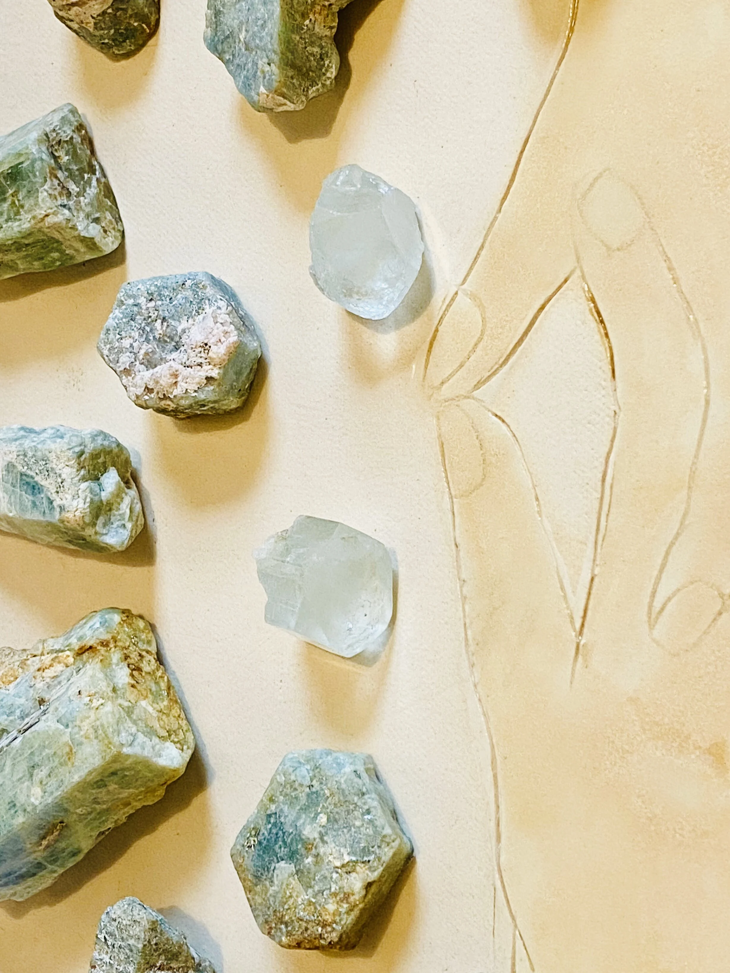 Encourage the gentle flow of Aquamarine by placing a piece on the throat while laying down before bed. Breathe deeply as you let it relax your anxious soul and reconnect you to a more conscious way of being.